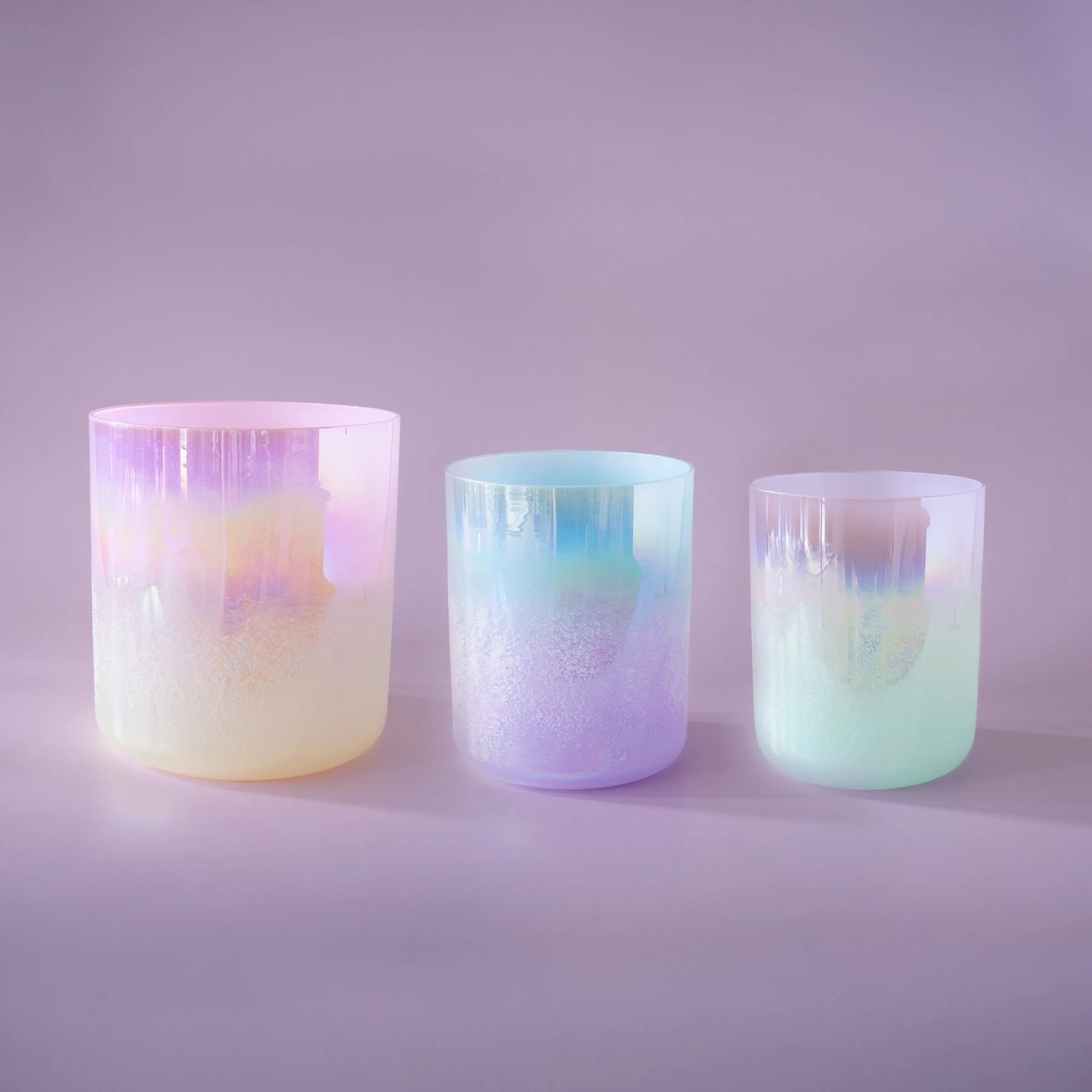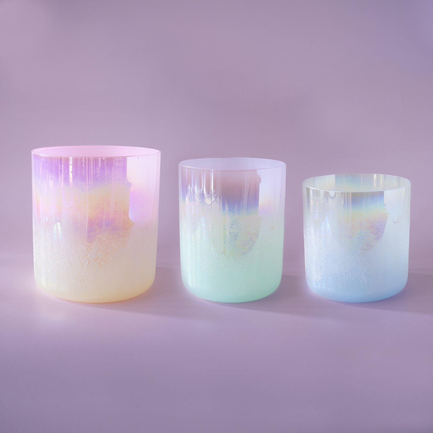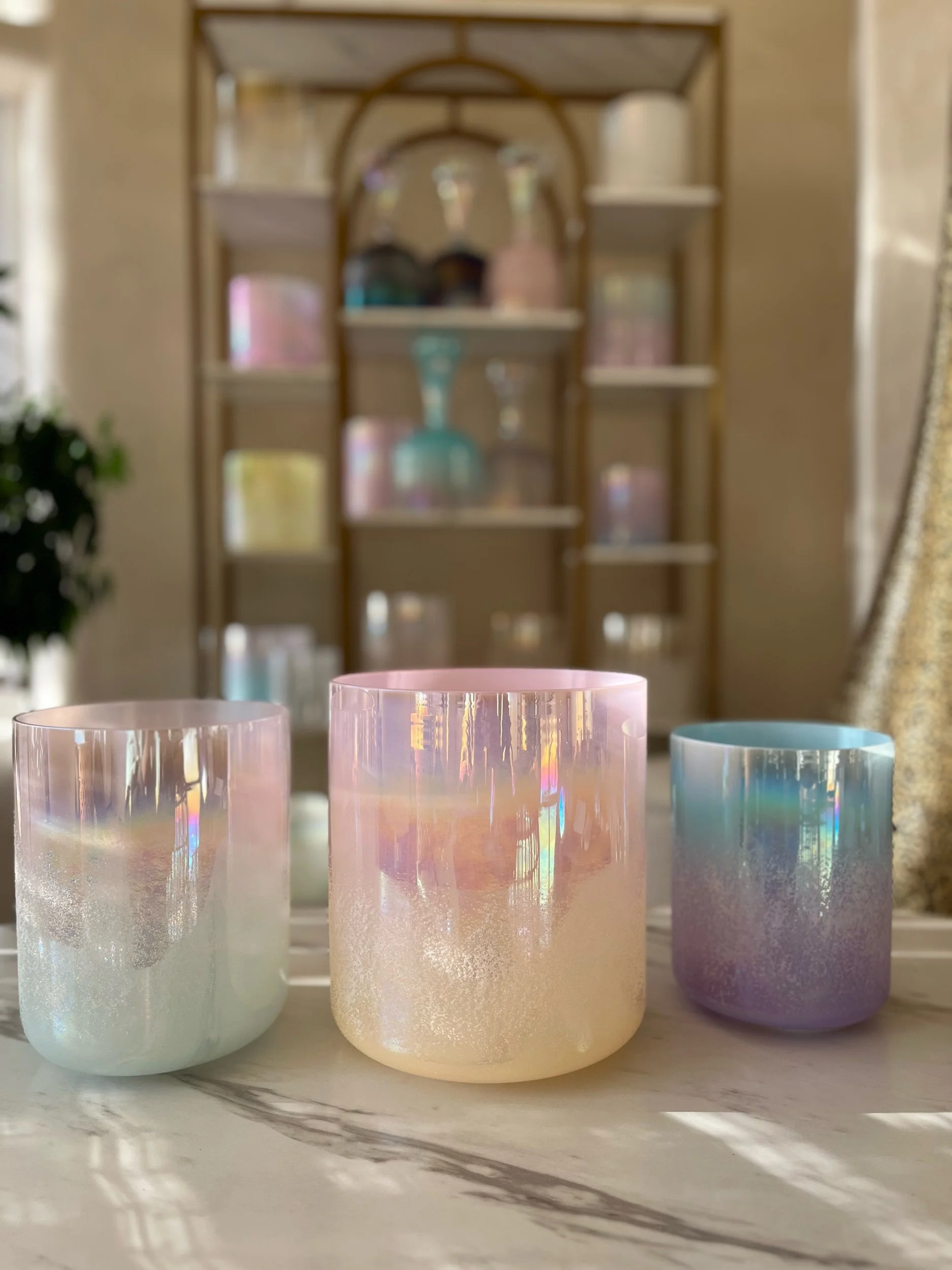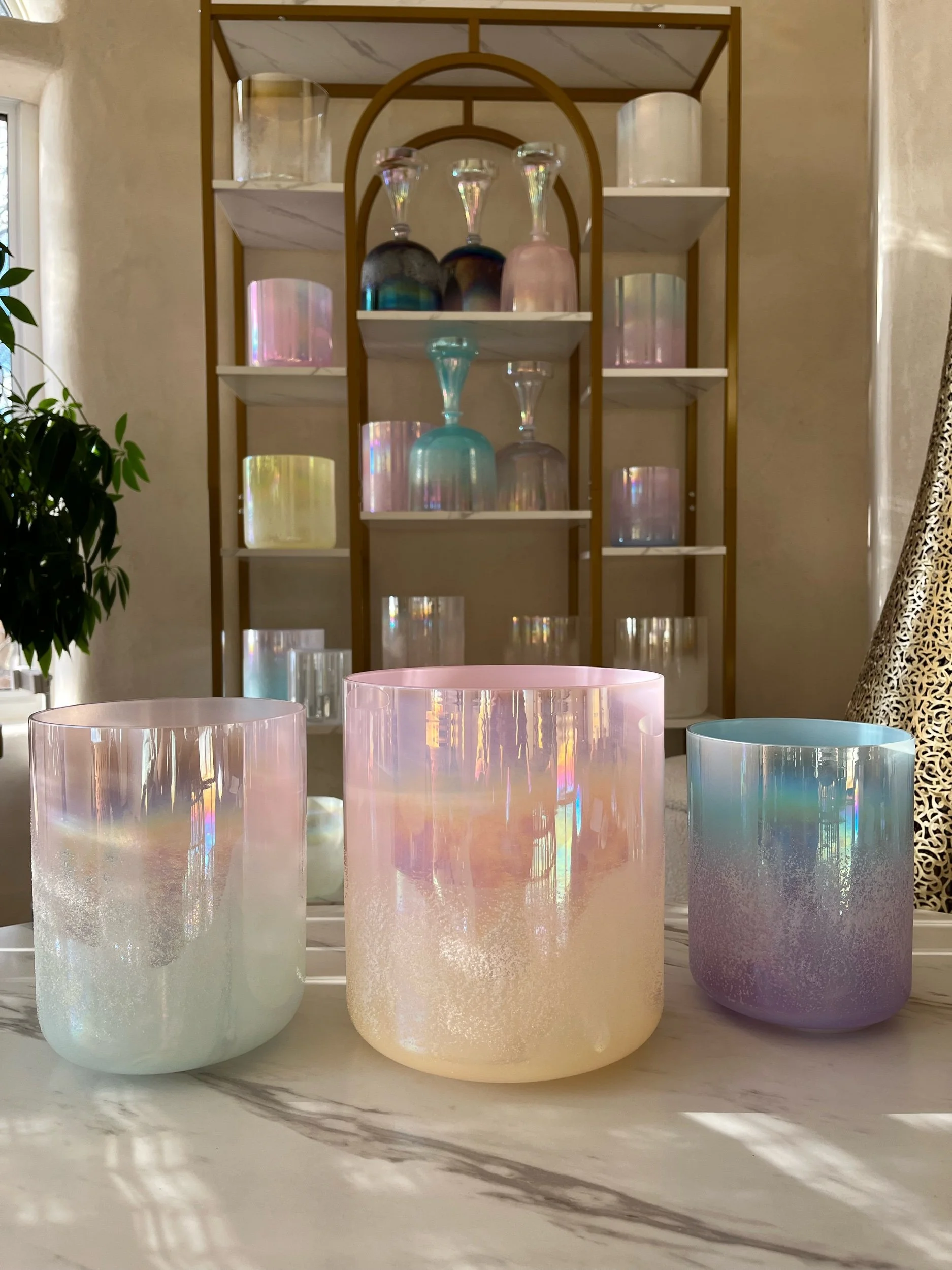 When I entered the world of sound healing, I found it incredibly difficult and time-consuming to find the right set of bowls that harmonized together. I started with frosted bowls but didn’t like how heavy and bulky they were, nor the scraping sound the wand made. Then I found some clear lightweight bowls, but they were random one-offs, lacking quality and impossible to create a set from. I invested TENS of thousand of dollars into building a set of crystal tones bowls, but finding matching and harmonized bowls from various stores and vendors took hours and hours online. While beautiful, I’m too scared to travel with them or take them outside because of the hefty loss if they break.