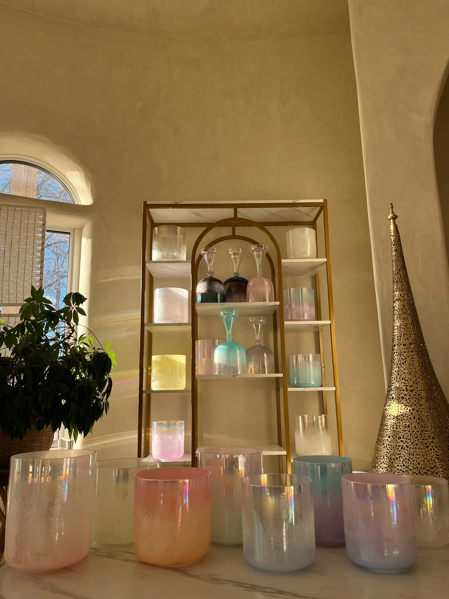 This gemstone infused chakra set opens the Diamond Rainbow Body, the full luminous spectrum of your inner light flowing from Root to Soulstar. Each bowl carries a soft aurora gradient, mirroring the rising of life force through the central channel and the gentle expansion of higher consciousness through the body.