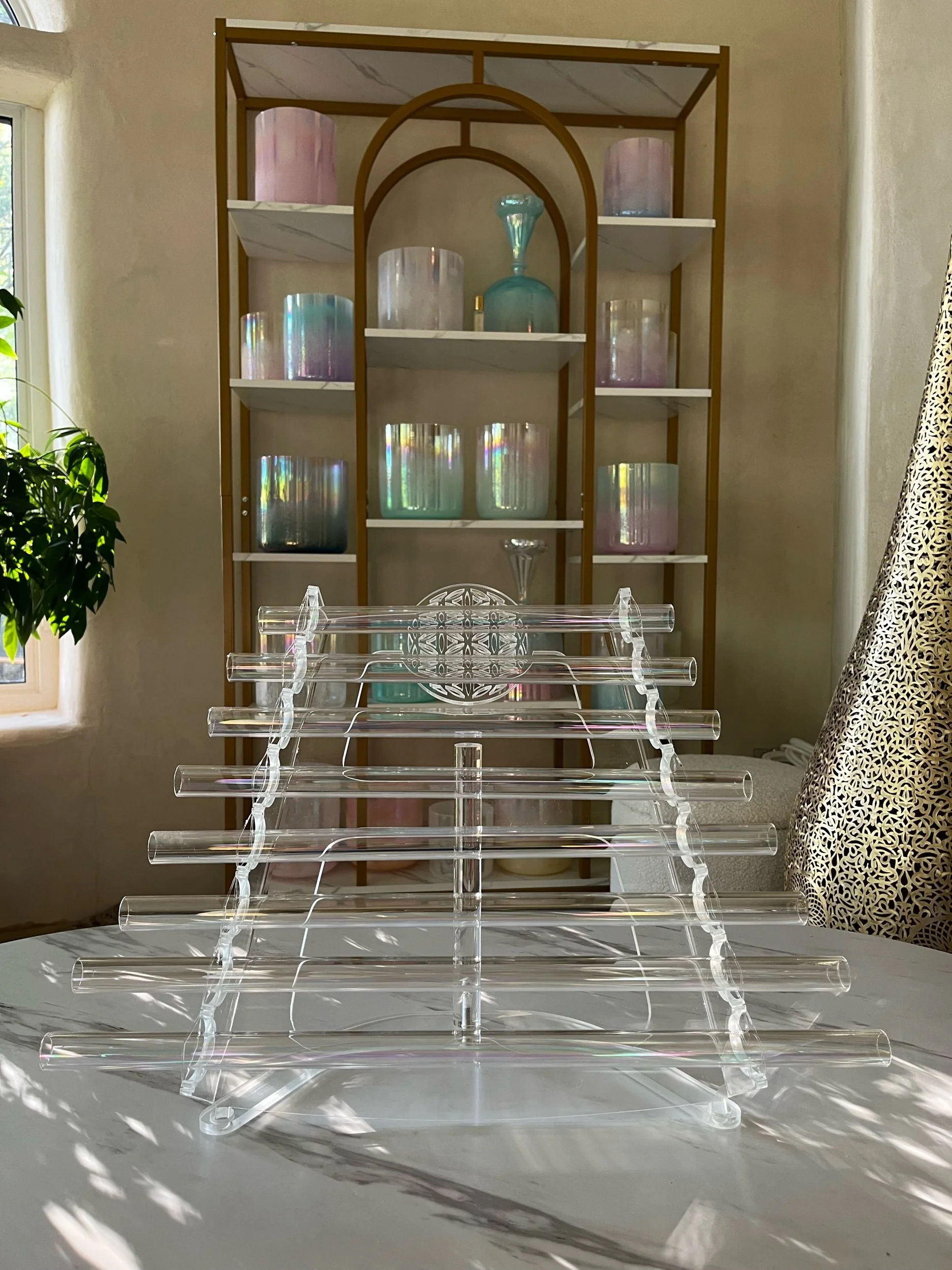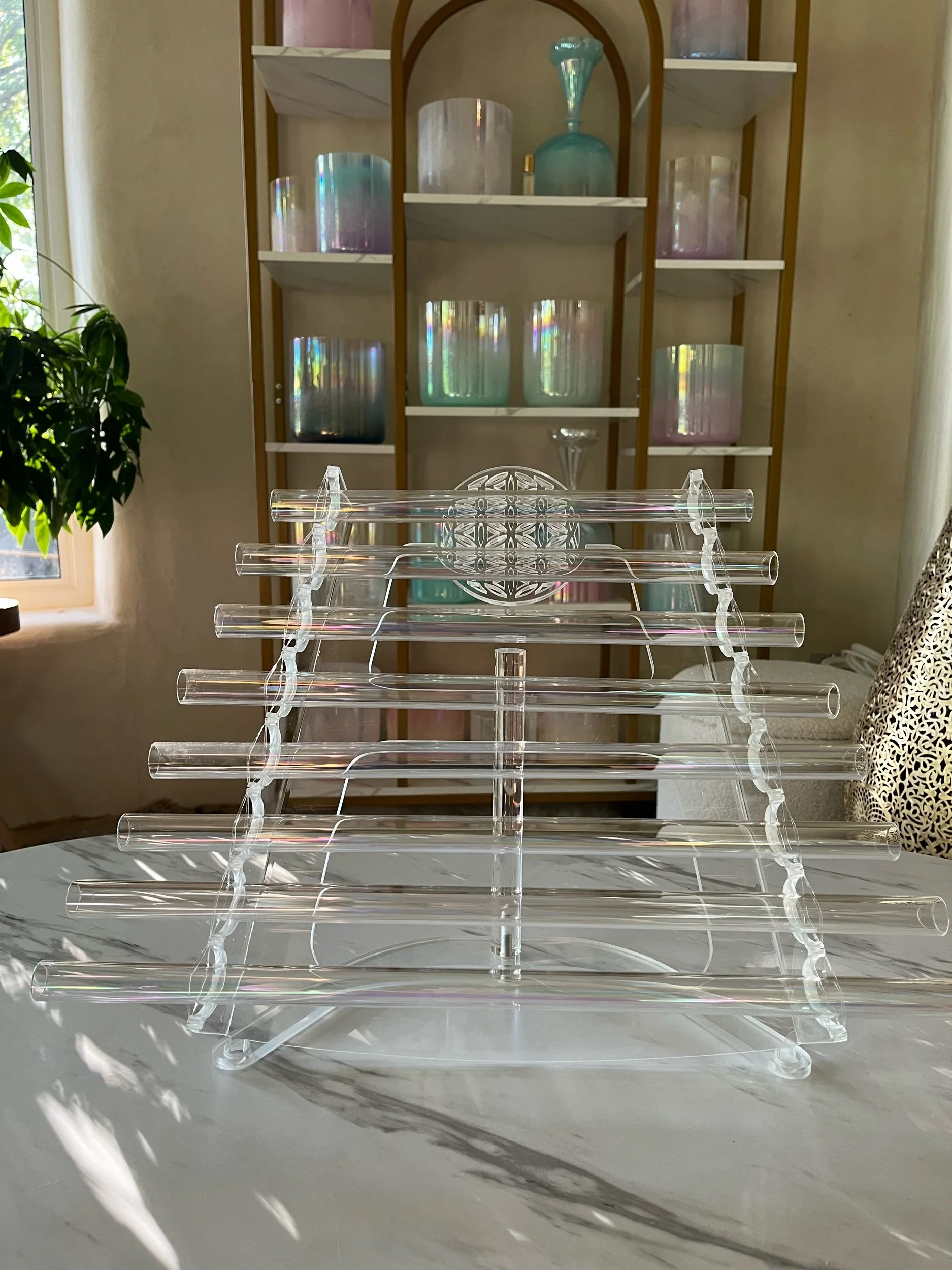 Invite celestial harmony into your sound practice with the Flower of Life Crystal Harp. This radiant instrument is crafted with pure quartz crystal infused with Titanium, giving it a shimmering iridescent glow and a vibrant, activating resonance. Its tones carry a luminous clarity that supports deep meditation, healing ceremonies, and expansion of consciousness. ✨